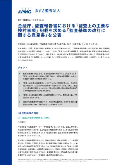 会計・監査ニュースフラッシュ - 金融庁が、2018年7月6日に公表した「監査上の主要な検討事項」記載を求める「監査基準の改訂に関する意見書」の概要を解説します。