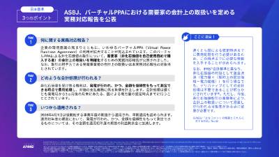 企業会計基準委員会(ASBJ)は、2025年11月11日に、バーチャルPPAによる非化石価値の取引について、需要家の会計上の取扱いを明確化するための実務対応報告第47号「非化石価値の特定の購入取引における需要家の会計処理に関する当面の取扱い」を公表しました。