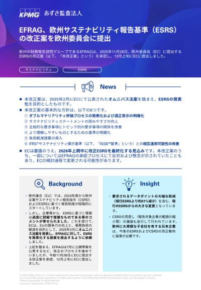 欧州の財務報告諮問グループであるEFRAGは、2025年11月28日、欧州委員会(EC)に提出するESRSの改正案を承認し、12月上旬にECに提出しました。