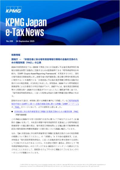 国税庁は、「非居住者に係る暗号資産等取引情報の自動的交換のための報告制度」に関する情報を集約している「暗号資産等報告枠組み(CARF)に基づく自動的情報交換に関する情報(「CARFコーナー」)」のページにおいて「非居住者に係る暗号資産等取引情報の自動的交換のための報告制度(FAQ)」を公表しました。