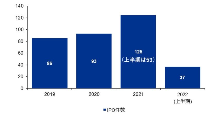 本年のグローバルの資本市場環境は荒れ模様であり、本邦でもIPOの件数は、過去最高水準の125社であった昨年(上半期で53件)と比較し減少している。例年、下半期は上半期と比べ件数は多く、本年はまだ期は終わってはいないが、昨年との比較では低調となっている。