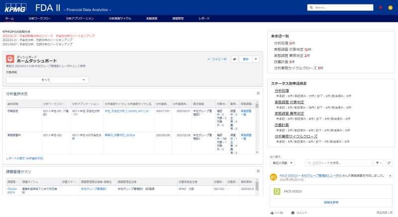 FDAIIは、2020年7月にリリースしたFDAを大幅にバージョンアップしたクラウドベースのセキュアで拡張性の高い業務支援プラットフォームです(図表2参照)。あずさ監査法人が有する経理ガバナンスに関するデータ分析ノウハウをベースとした標準分析ツール9種が利用でき、目的に応じてリスク分析シナリオなどのカスタマイズや独自の分析処理の組込みが可能です(図表3参照)。親会社や統括会社による分析業務を定義・計画し、実施状況を把握するとともに、親子間での分析結果の共有やそれに関するコミュニケーション、実態調査のための質疑応答や証跡授受、顛末管理などを行なえる分析業務支援機能も備えています(図表4参照)。