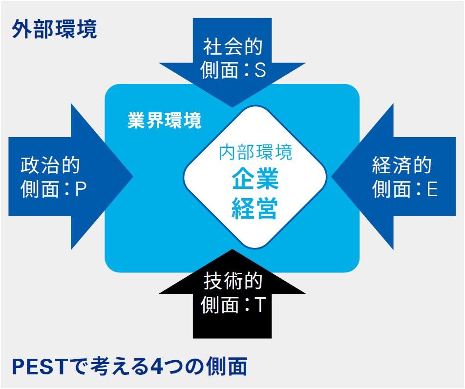 現代の社会動向と企業経営は複雑に関連し合っていますから、未来洞察をするには自社を取り巻く外部環境の分析が必須となります(図表 1参照)。このような外部環境分析を行うフレームワークの 1つに、「Politics(政治)」、「 Economy(経済)」、「Society(社会)」、「 Technology(技術)」の4つの側面から自社に与える影響を考察するPEST分析があります。 KPMGアドバイザリーライトハウスデジタルインテリジェンスの未来洞察は、そのなかの技術的トリガーから外部環境を俯瞰し、企業との接点を考察します。