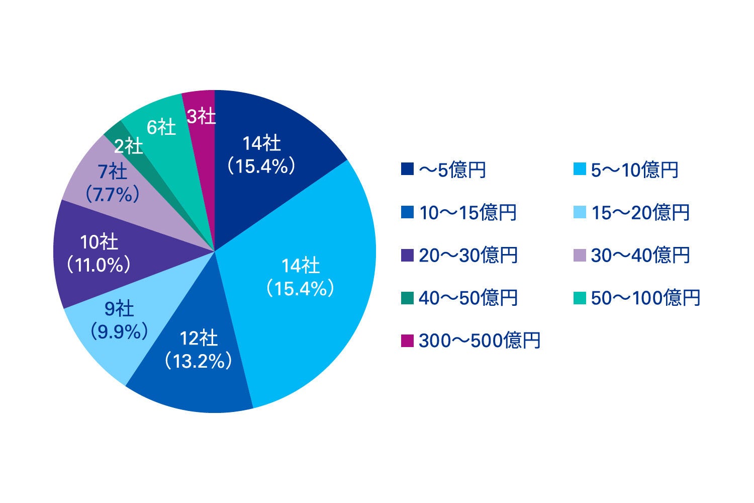 また、オファリングサイズは一部の大型案件によって平均値が押し上げられます。しかし2022年は、IPOした91社のうちオファリングサイズが5億円未満の案件が14社(約15.4%)となり、全体の約9割が50億円未満となりました(図表3参照)。