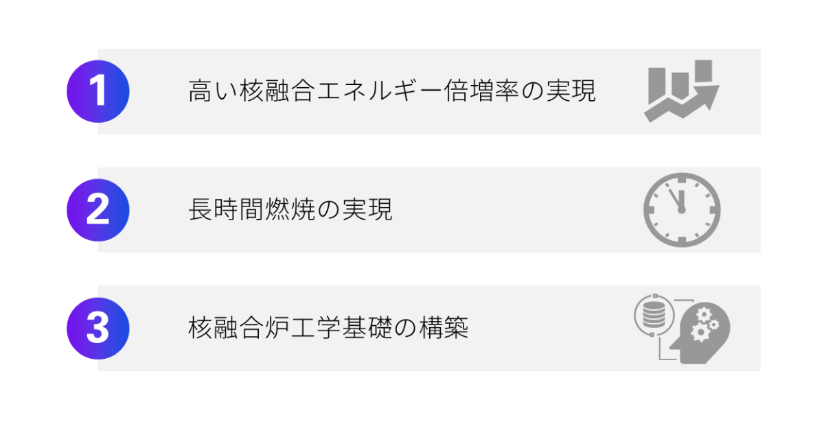 現在は科学的・技術的実証フェーズにあり、大きく三つの課題がある。一つ目は高い核融合エネルギー倍増率の実現である。これは発電ソースとして使用するために、投入エネルギーに対して高い倍増率でエネルギーを抽出できる効率性が求められる。ITER計画における目標であるエネルギー倍増効率10に対して現時点で、1.2を達成しているが、商用化には30が必要と言われている。二つ目は長時間燃焼の実現である。これは核融合反応を連続して起こすべく、超高温のプラズマを数か月~1年程度炉内に閉じ込めることが求められる。三つ目は核融合炉工学基礎の構築である。これは実用化に向けた機能として、定常かつ安定した電気出力、高い稼働率、三重水素増殖の達成が必要となる。特にヘリウムおよびプラズマ中の不純物の減少に使用されるダイバーダの設計が大きな課題となっている。