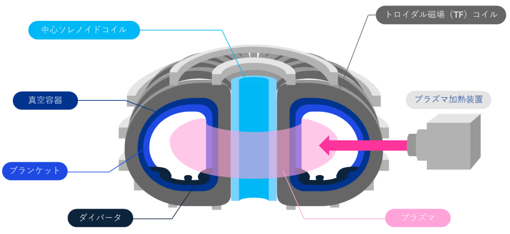 このプラズマを生成する装置が真空容器であり、プラズマを1億度以上に加熱する装置がプラズマ加熱装置である。更にプラズマを長時間保持させるには、磁場を利用してプラズマを炉の中に浮かべる必要があるが、この磁場を安定して作り出す装置がトロイダル磁場(TF)コイルである。他にも縦方向の磁場を作るコイルである中心ソレノイドコイル、粒子排気、熱除去、プラズマ閉じ込め改善の3つの機能を担うダイバータ、発生するエネルギーの殆どは高速で運動する中性子として放出されるが、これを受け止め発電機を回す熱エネルギーとして取り出す変換器であるブランケットがある。これらの装置を組み合わせたものが核融合炉である。