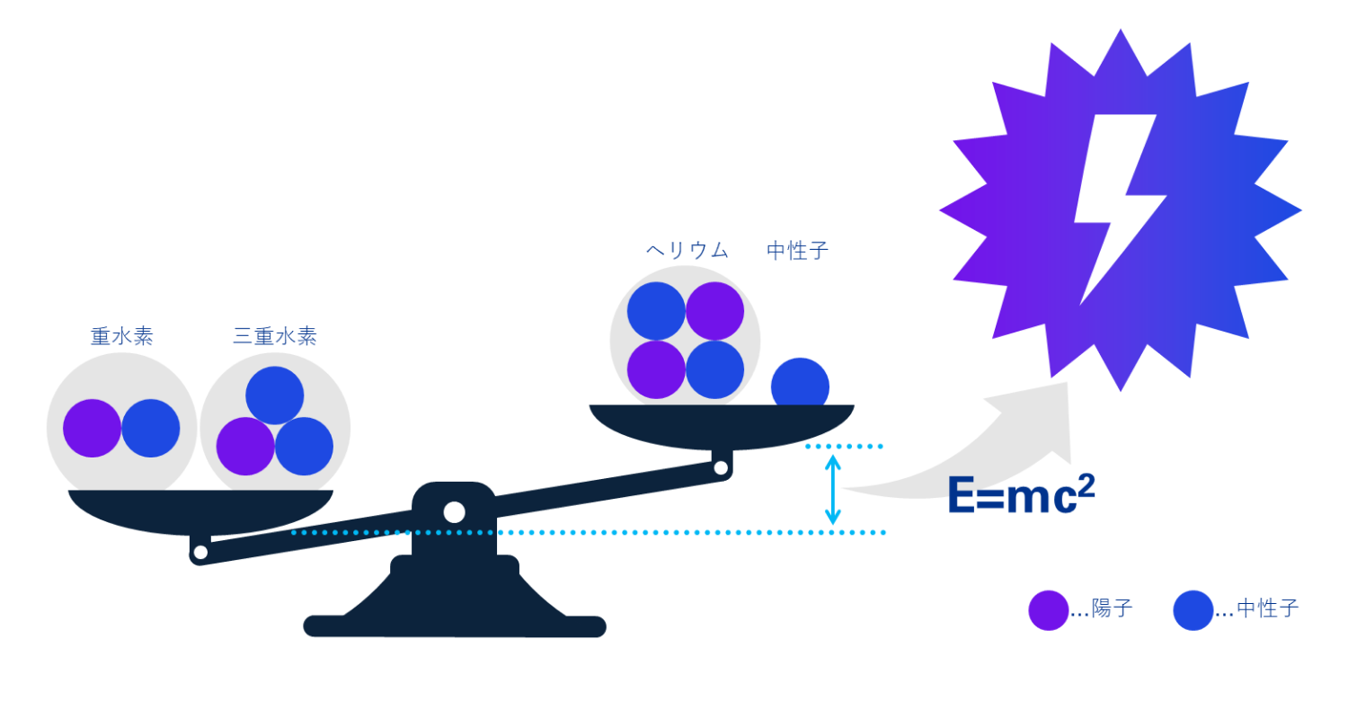 核融合発電とは「プラズマ状態の原子核同士を融合させることで膨大なエネルギーを発生させる」と述べたが、物質からエネルギーを生み出すために進められている方法が、重水素(deuterium)と三重水素(tritium)の原子核が衝突して融合し、ヘリウム(helium)と中性子(neutron)が放出され、その過程で莫大なエネルギーを放出するという物理現象である。核融合反応が起きる前の重水素(D)と三重水素(T)の質量より、格融合反応が起こった後のヘリウムと中性子の質量が軽くなることから、その差分の質量がエネルギーに変わるというメカニズムである。これは、重水素と三重水素の頭文字であるDとTを取り上げD-T反応と呼ばれる。