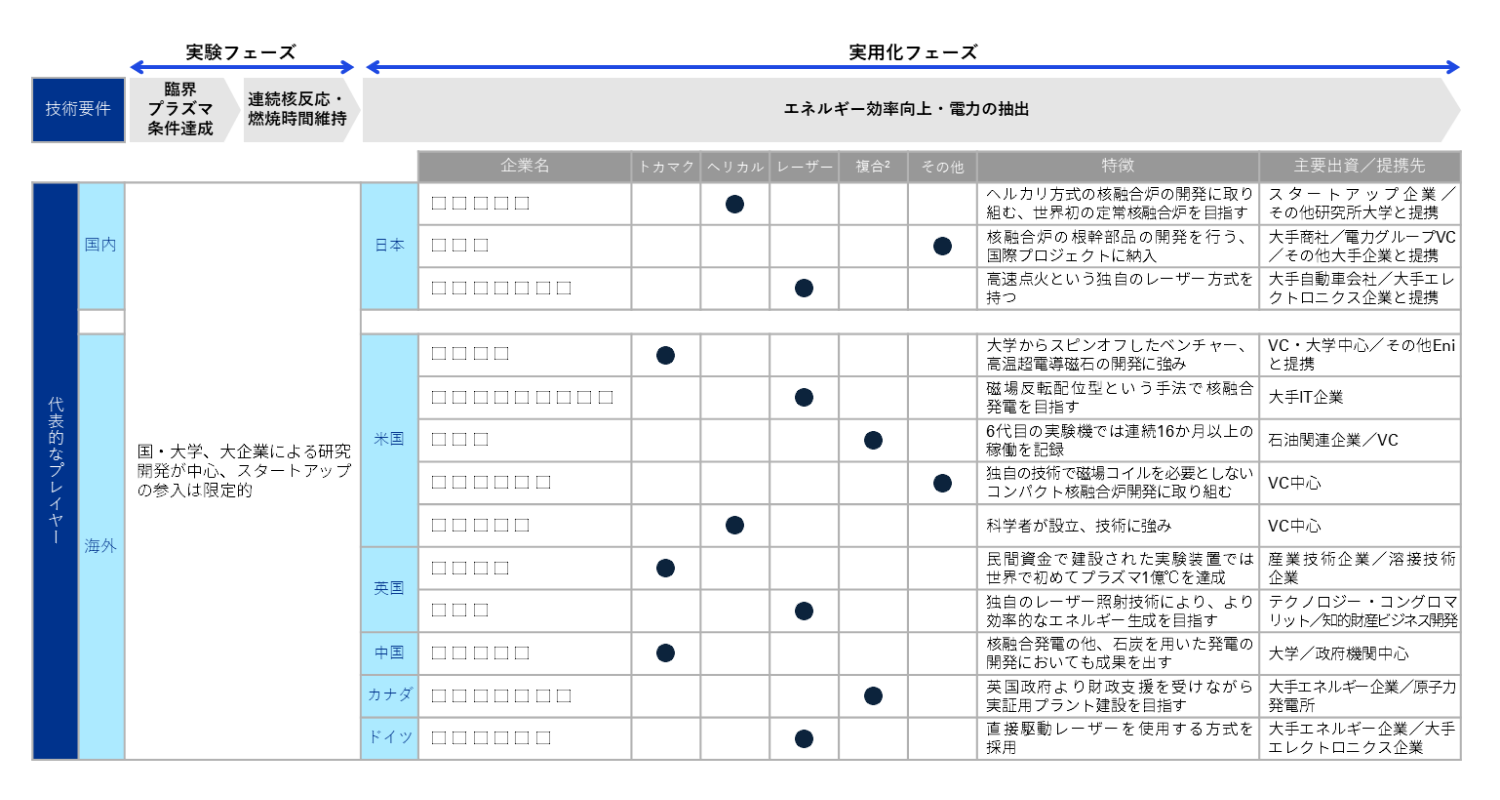 出所:KPMGデータベース、文部科学省「フュージョンエネルギー・イノベーション戦略」、核融合炉業界地図、6つの主要機器で市場に食い込む日本メーカー」 日経クロステック(2023/4/18)、公開情報よりKPMG作成