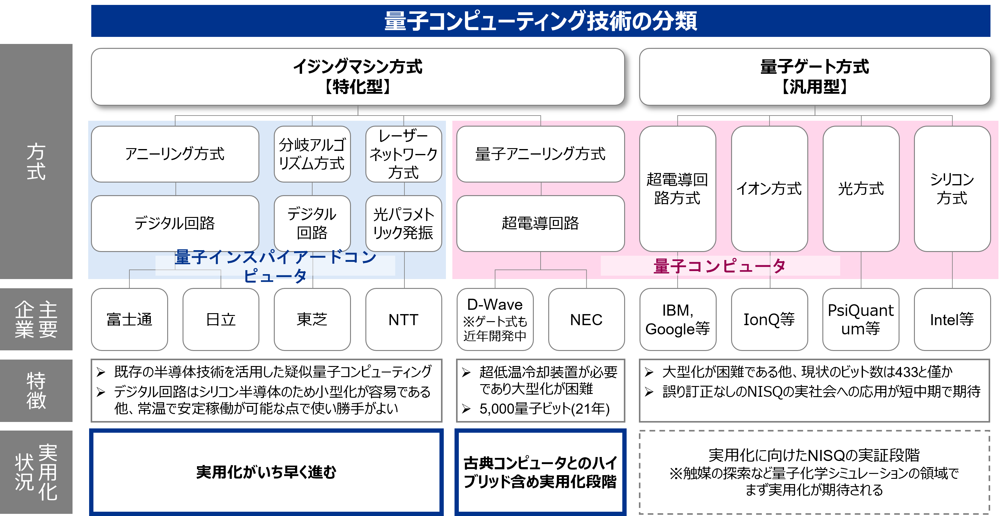 量子ゲート方式のビット数が発展途上であることと大型化に課題がある一方、イジングマシン方式は、既存の半導体技術を活用した疑似量子コンピューティングで、デジタル回路はシリコン半導体のため小型化が容易である他、常温で安定稼働が可能な点で使い勝手がよい、といった特性から実用化がいち早く進んでいる。特に、量子コンピュータの計算手法を取り入れた古典コンピュータである量子インスパイアードコンピュータは、組み合わせ最適化問題を高速に解くマシンが各メーカーで開発されている。