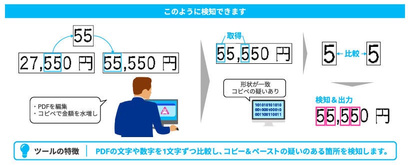 具体的な手法としては、PDF上の文字をフォント解析し、各文字のフォントを判別します。その際に、改ざんされた文字のフォントが、他の文字のフォントと異なる場合にアラートを出すことができます。