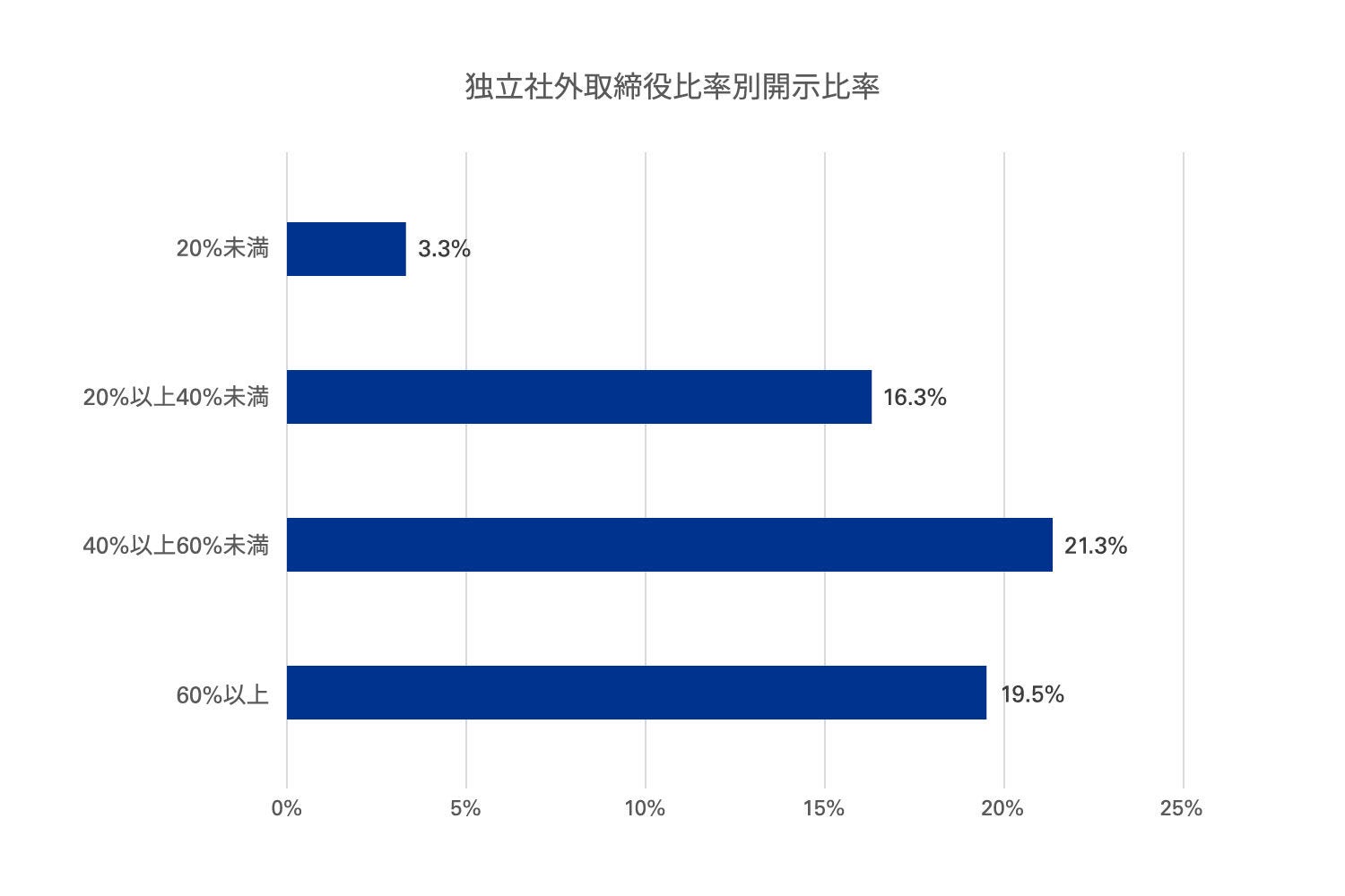 実際の開示比率は、独立社外取締役比率が20%未満の場合3.3%と低く、20%以上40%未満の場合16.3%、40%以上60%未満の場合21.3%、60%以上の場合19.5%となりました。独立社外取締役比率が低い企業では開示が行われない傾向は見て取れたものの、20%以上の企業における開示比率に大きな差異は確認できませんでした。