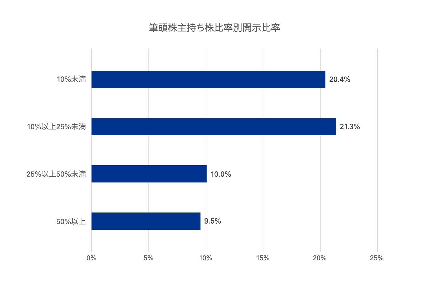 さらに親会社は存在しないものの、創業者などの個人が企業を支配している場合を想定し、筆頭株主の持ち株比率別に開示比率を分析しています。筆頭株主の持ち株比率が10%未満の場合の開示比率は20.4%でした。また、同比率が10%以上25%未満の場合の開示比率は21.3%となり、共に20%を超えています。一方で、持ち株比率が25%以上50%未満になると開示比率は10.0%に低下し、持ち株比率が50%以上となると開示比率は2桁を切って9.5%となっています。