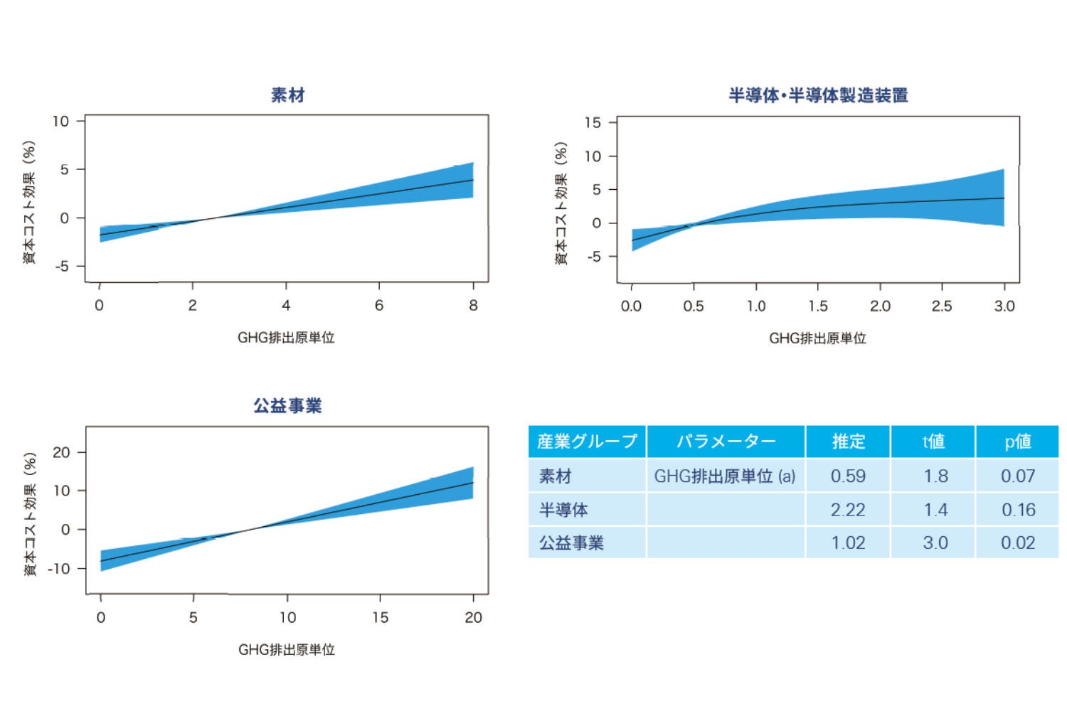 図表4 右下に示す重回帰モデルの分析結果から、GHG排出量の原単位を1 t/ mJPY下げることで、株主資本コストは、素材で0.59%、半導体・半導体製造装置で2.22%、公益事業で1.0 2%減少する効果があることがわかります。