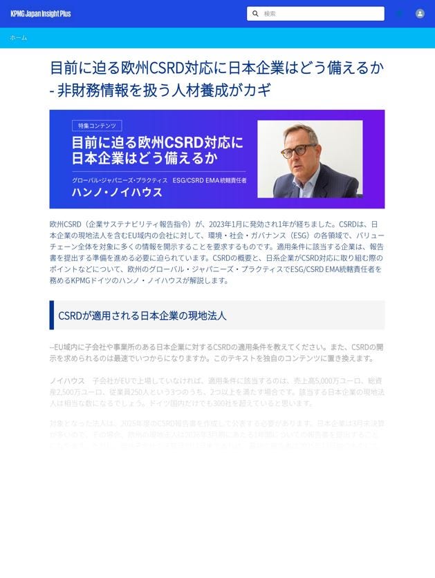 日系企業がCSRD対応に取り組む際のポイントについて、KPMGドイツのハンノ・ノイハウスが欧州・EU域内企業の最新動向を踏まえて解説します。(会員限定コンテンツ)