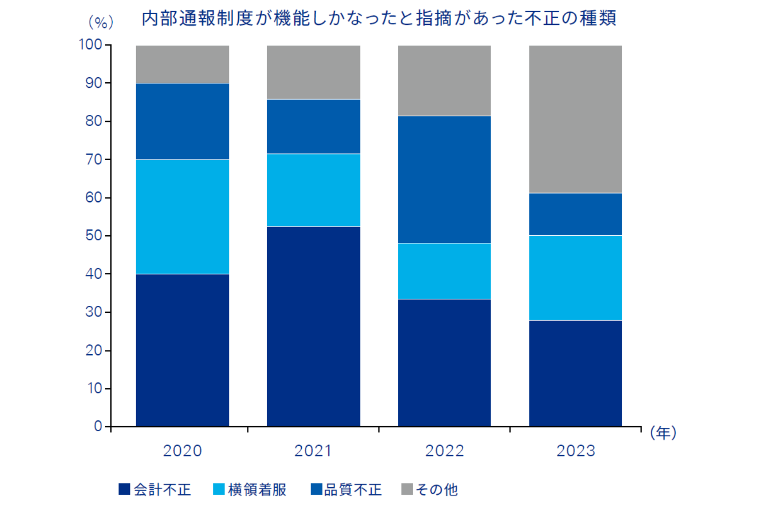 前述のとおり、調査報告書における内部通報に関する記述は、程度に差はあれ、総じて「有効に機能しなかった」という評価がなされています。それでは、不正等の種類によって、内部通報が機能しないというケースがあるのでしょうか。