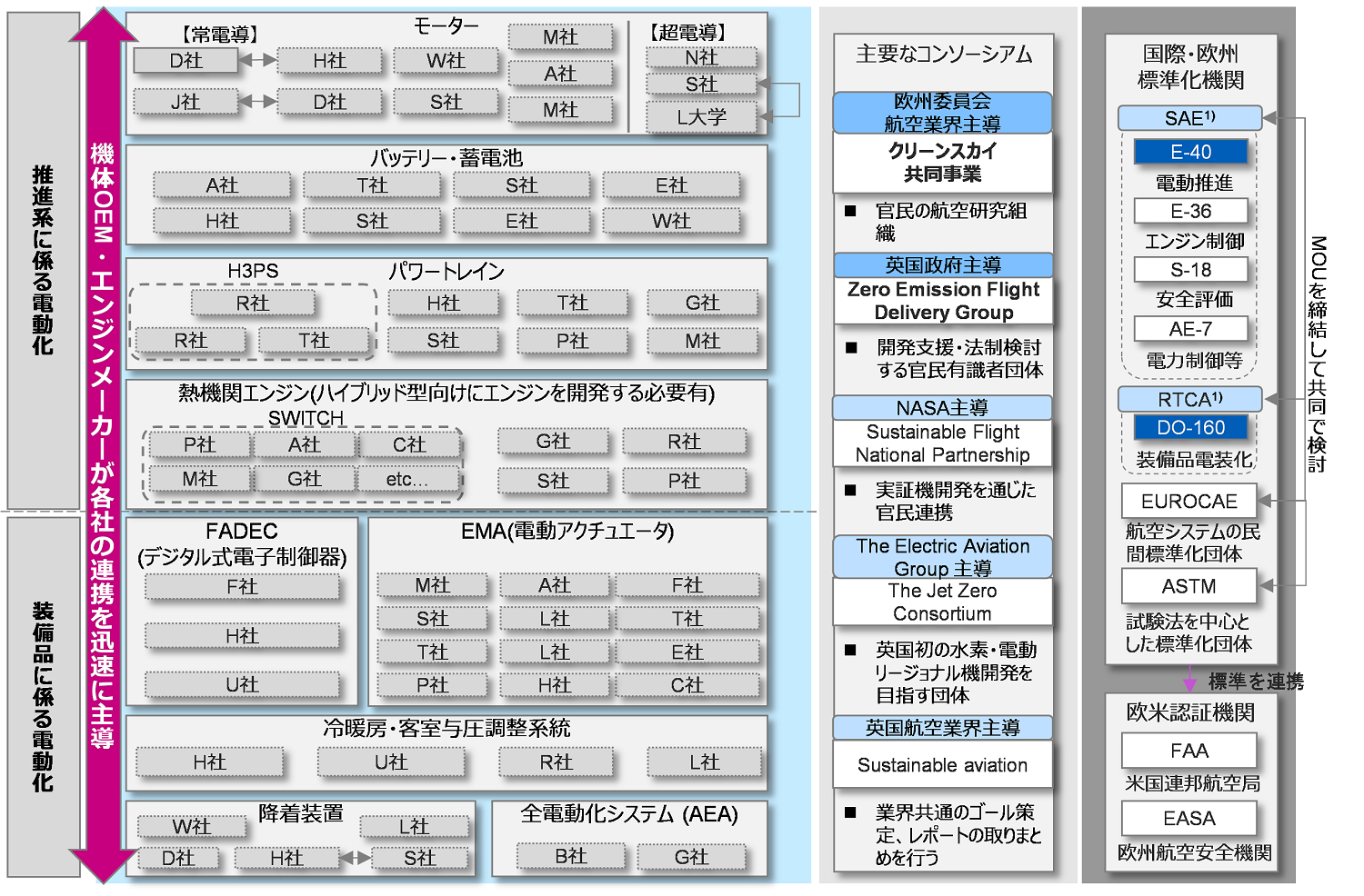 実際、SAE International4は「自動車産業におけるシステム・部品の要素技術の電動航空機向け転用」を期待している。こうしたコンソーシアムでは、参加企業ごとに「この技術は外に開示できる・できない」といった制限があり、連携がスムーズにいかない問題がよく生じる。よって社会実装の第一歩となる標準化においては、キーテクノロジーを有する企業が海外技術開発団体の動きと同様に、自ら主導して連携を促すことも有用と考える。