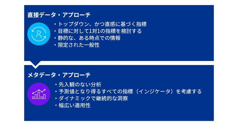 いずれの業界においても、成功の主な秘訣は調査項目やトップダウンによる直感的な期待に基づく1対1の指標のみが考慮される従来の「直接データ」手法から離れることにあります。代わりに、メタデータのアプローチが採用され、アクセス可能なすべてのデータを先入観なしに分析することで、明確に定義された目的との相関関係の見極めが行われます。
