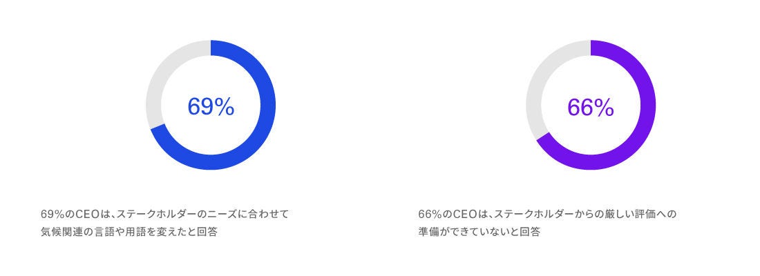 また、社会的流動性や気候変動などの問題が政治色を帯び、二極化してきていることが、CEOの新たな課題となっています。その結果、一部のCEOはESGの取組みを伝える方法を工夫し、69%(日本:77%)のCEOは気候関連の戦略は維持する一方で、ステークホルダーのニーズに合わせて、社内外で使用する言語や用語を変えたと回答しました。一例として、政治的、社会的な観点から包括的な「ESG」という用語よりも「サステナビリティ」などの一般的な用語を使用しています。