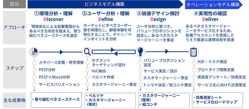 | 4. Deliver (実現性の確認) | 新しいカスタマージャーニーを基に、メタバース空間の運用方法を決定。プロトタイプ開発を通じて、リスクの特定や改善案、およびコスト対効果を検証。プロトタイプによる効果測定を実施し、サービス品質を高めるためのサービス化ロードマップを作成 | 開発事業者向けに絵コンテを作成し、実証実験を行ったうえでメリットや課題など抽出し、検証結果を取りまとめる |