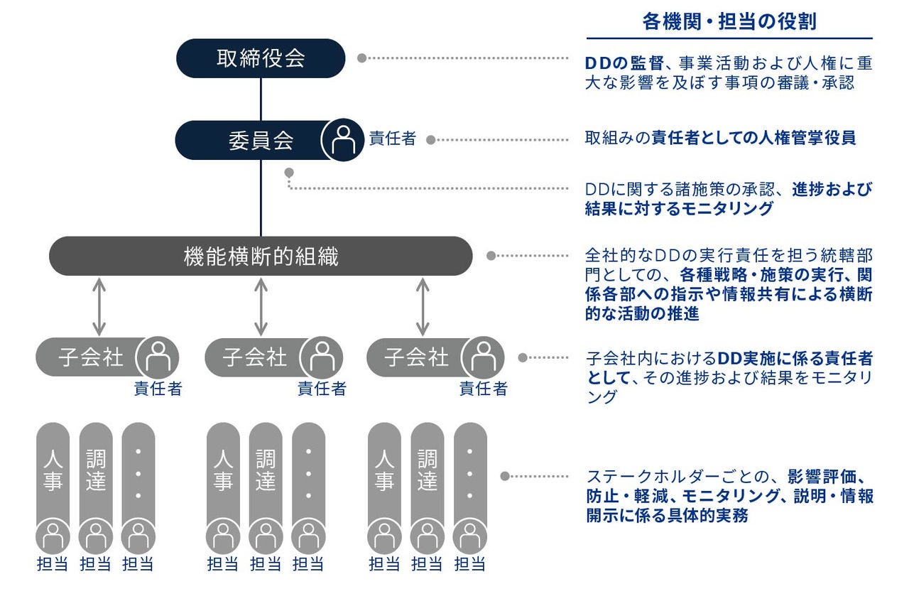グループ全体として人権・環境DDを実施するために、現場の業務レベルから取締役会にいたる権限と責任の割当てにより責任の所在や役割を明確にし、人権・環境責任を果たすためのガバナンスを整備することが必要と考えられます( 図表3 参照)。