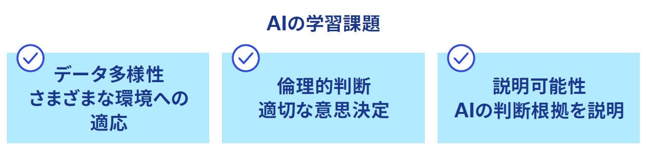 AIとロボティクスの融合は、人間の生活をより豊かに、そして便利にする可能性を秘めた技術革新です。しかし、AIの能力拡張に向けて、いくつかの課題も残されています。たとえば、さまざまな環境に適応できる能力は学習データに大きく依存しており、すべての状況に対応できるデータを揃えることは困難です。