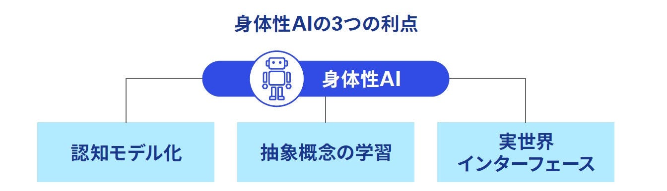 「身体性AI」とは、物理的な身体を持ち、現実世界と相互作用しながら学習・行動するAIのことです。従来のAIは、デジタル空間内のデータ処理が中心でしたが、身体性AIは、ロボットなどの物理的な身体を通じて、環境を認識・操作・反応することで、実世界と直接的に連携することが可能となり、それによって理解がより深く体系的になると考えられています。身体性AIは、以下の3つの利点から注目されています。
