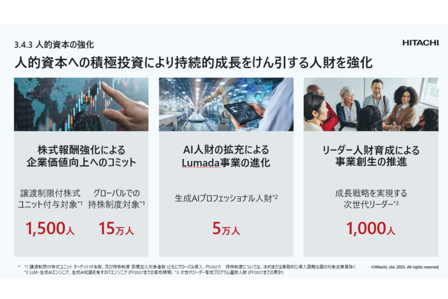 まず株式報酬制度を拡大し、従来の役員から約1500人まで対象を広げる予定です。これにより投資家視点との整合性を図り、長期的な企業価値向上へのコミットメントを促進していきます。特にアメリカ西海岸では、ハイパースケーラー企業との人財獲得競争が激化していますので、競争力のある報酬体系が不可欠なためです。