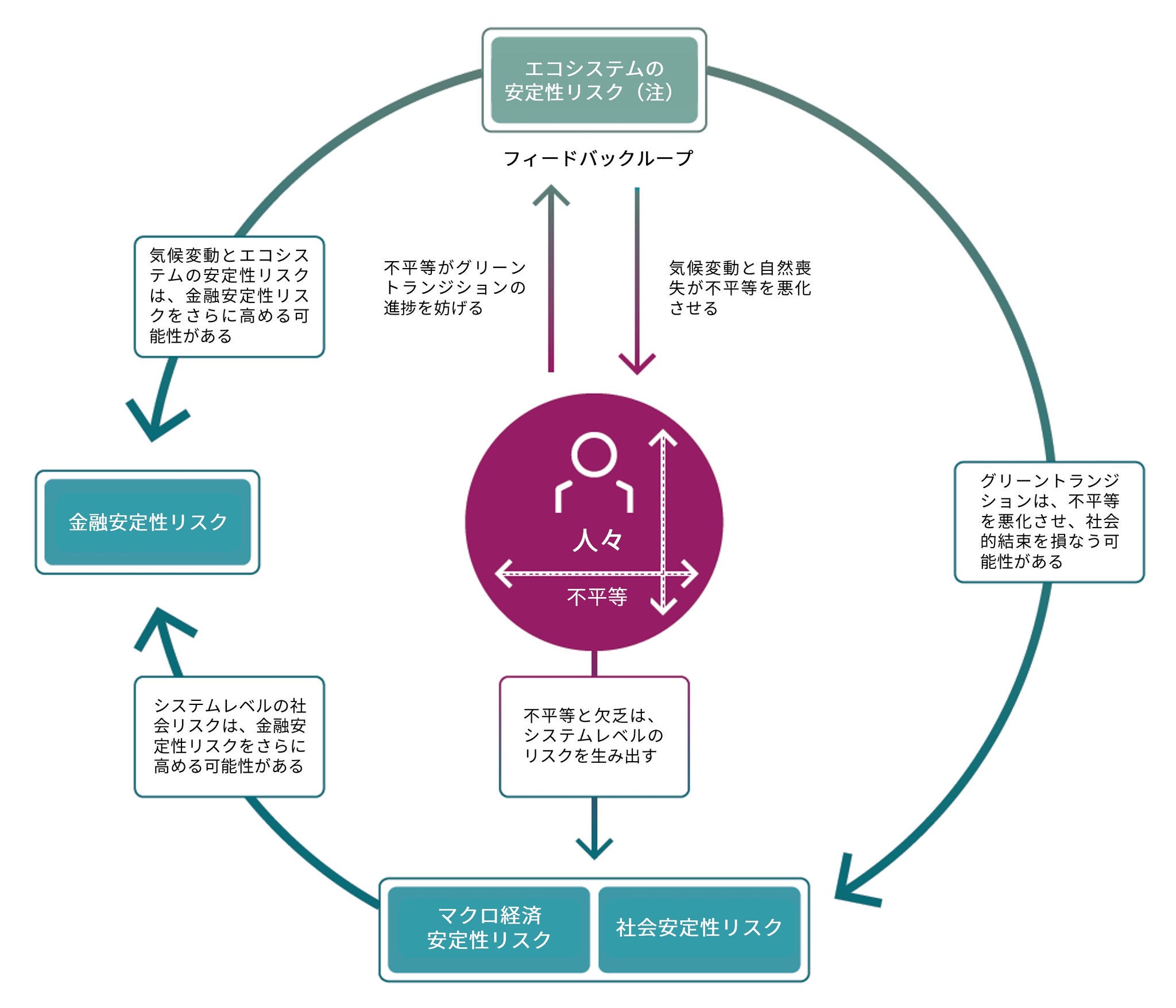 | 金融安定性リスク | 不平等が直接的に金融システムの脆弱性に寄与し、その安定性やレジリエンスを脅かす可能性のあるリスク |