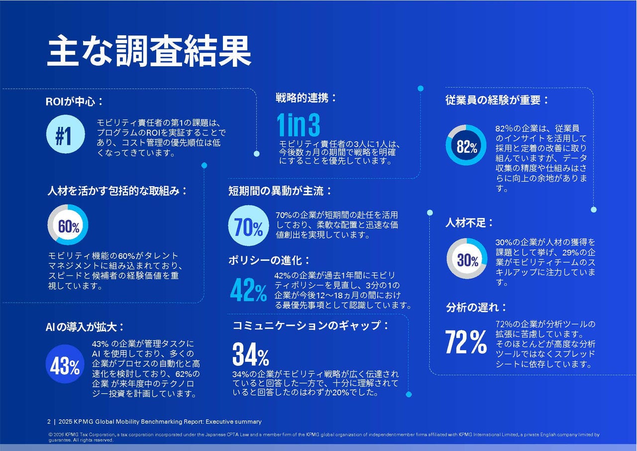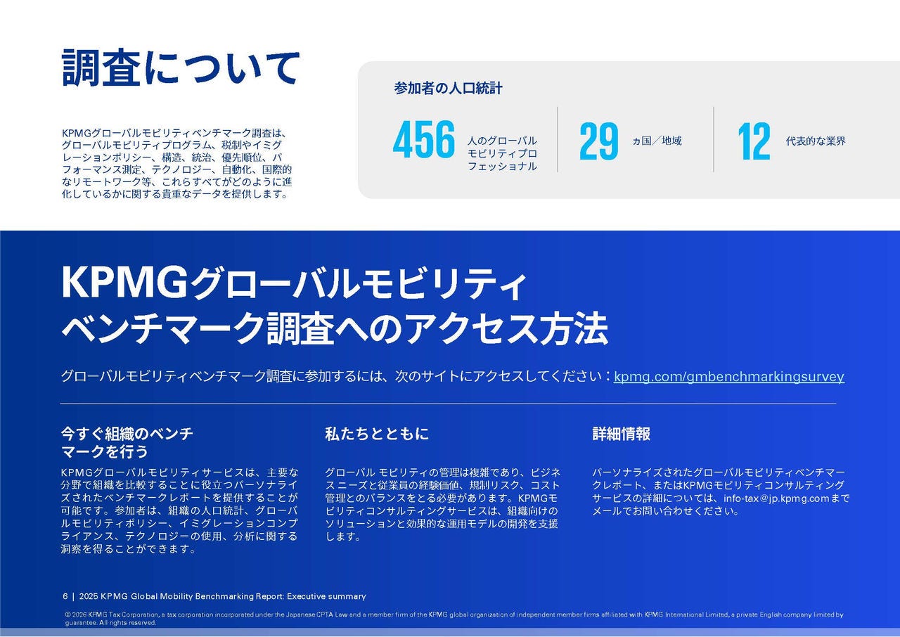 このたび、KPMGインターナショナルが発行した英語版レポートを基に、日本の皆様へ向けて要点をまとめた【日本語版】2025 KPMG グローバルモビリティベンチマーキングレポート - 未来志向企業のためのモビリティの優位性エグゼクティブサマリーをリリースいたしました。
