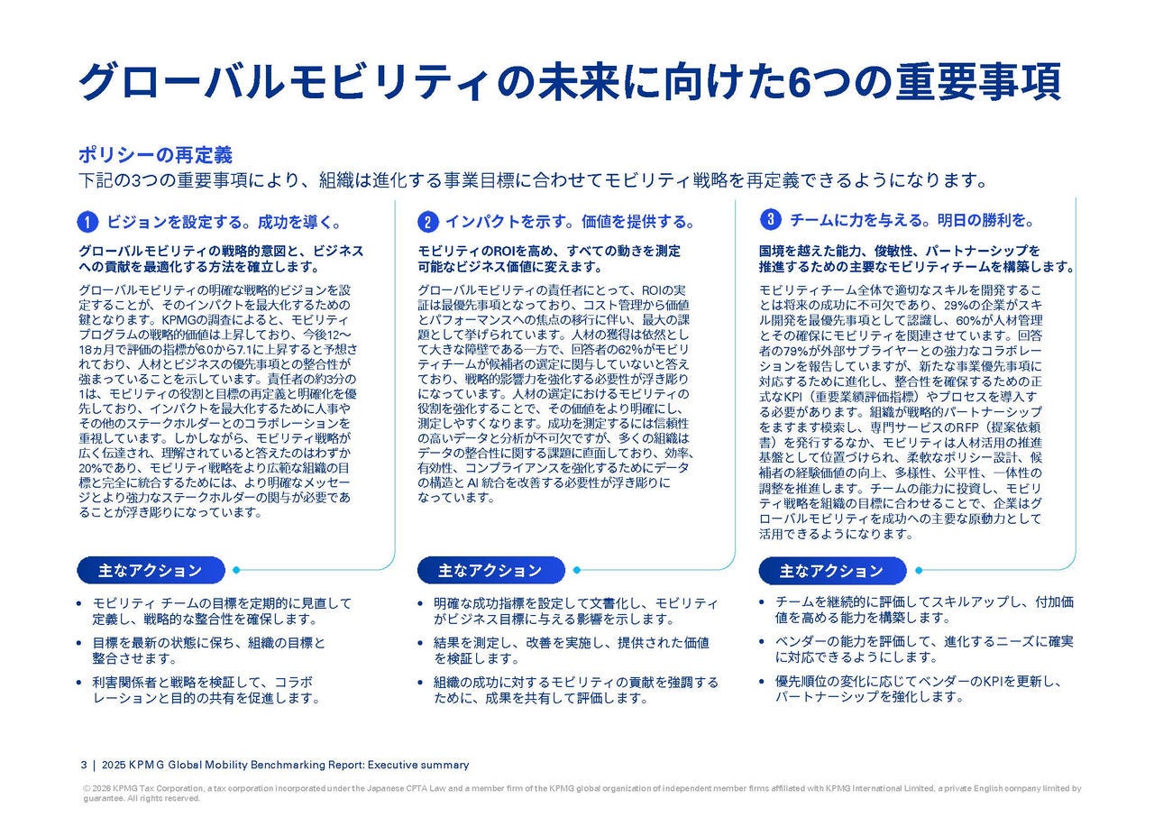 今日、世界中のモビリティ責任者は、経済の不確実性や地政学的な変動、革新的な技術、そして人材獲得競争といった新たな課題と機会に直面しています。こうした課題を乗り越えるために、KPMGでは「2025年グローバルモビリティベンチマーキングレポート—未来志向企業のためのモビリティの優位性」(英語)を発行いたしました。本年のレポートでは、先進的なモビリティチームが優先すべき6つの重要事項を取り上げています。