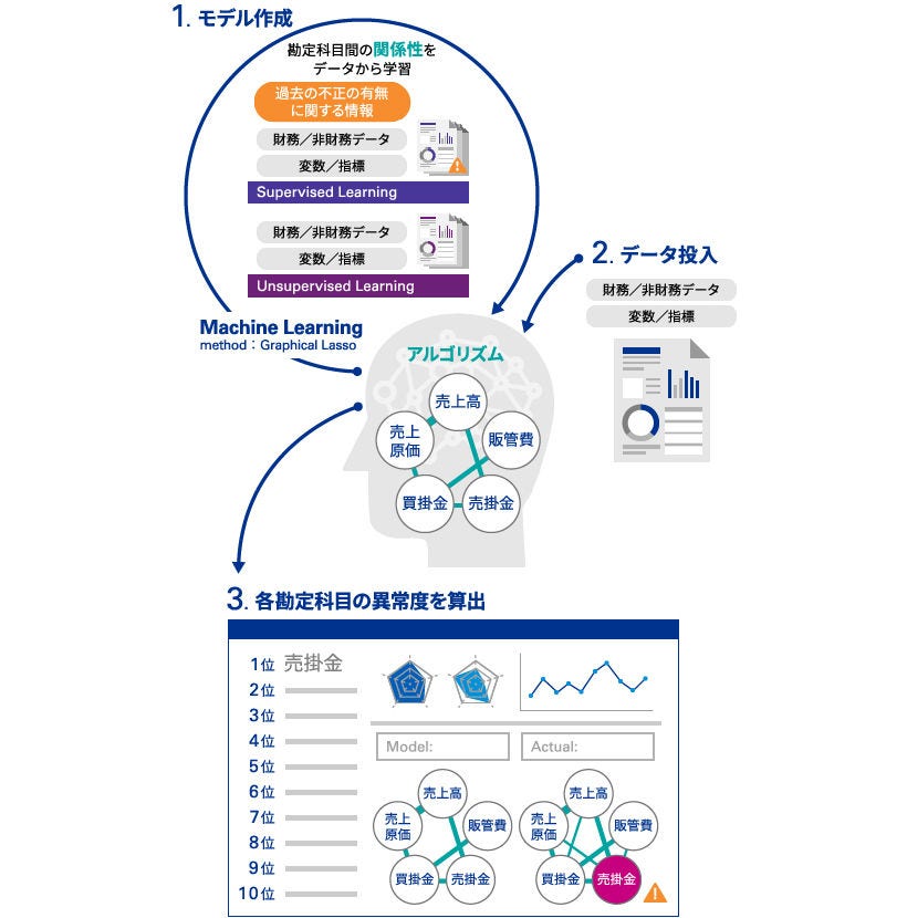 本特許技術では、Graphical Lasso※と呼ばれる手法を用いて、勘定科目間の関係性をデータから学習することで構築したモデルに、検証対象会社の会計情報をインプットし、各勘定科目の異常度を算出しています。本モデルは、1.過去の不正の有無に関する情報を与えることで学習を行うSupervised Learning、2.同情報を与えずに学習を行うUnsupervised Learningの二つの手法を含んだハイブリット構造を採用しており、過去に事例数が少ない不正会計であっても検知が可能です。
