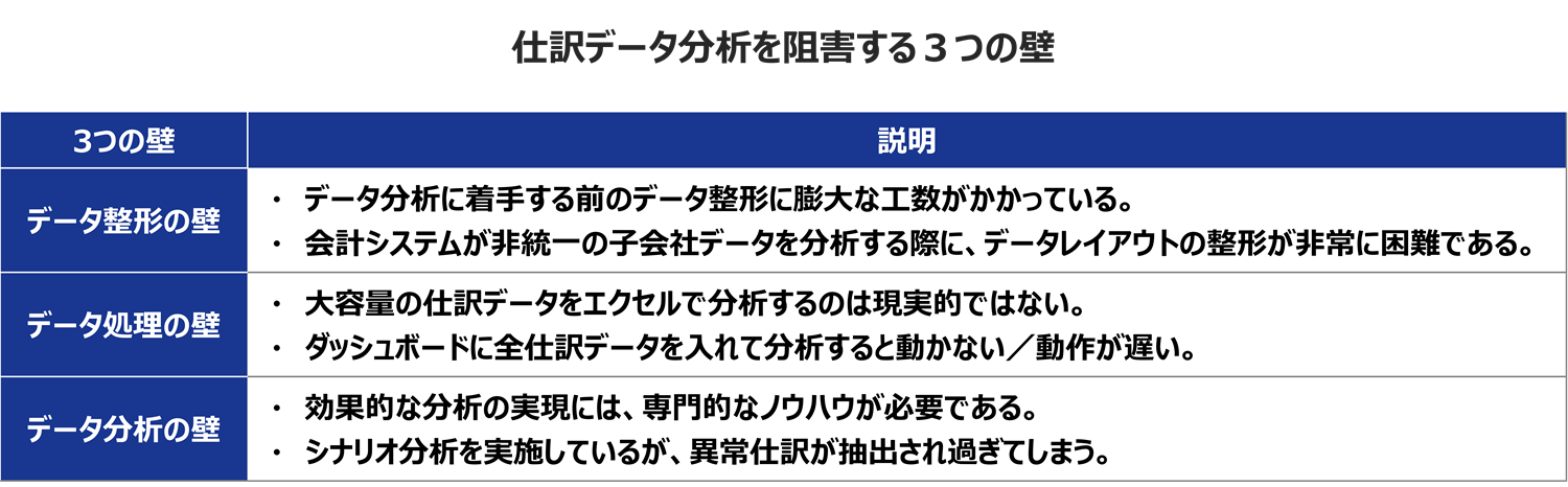 既に仕訳データ分析に取り組んでいる先進企業においても、主に以下の「3つの壁」が障壁となり、グループ子会社分析の効果や効率性に課題を抱えているという声が多く聞かれます。