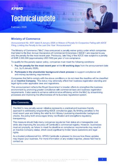 The Ministry of Commerce (“MoC”) has announced a penalty waiver policy under which companies that failed to file their Annual Declaration of Commercial Enterprises (“ADCE”) are required to pay only the penalty for the most recent year. Previously, late filing of the ADCE was subject to a penalty of KHR 2,000,000 (approximately USD 500) per year of non compliance.