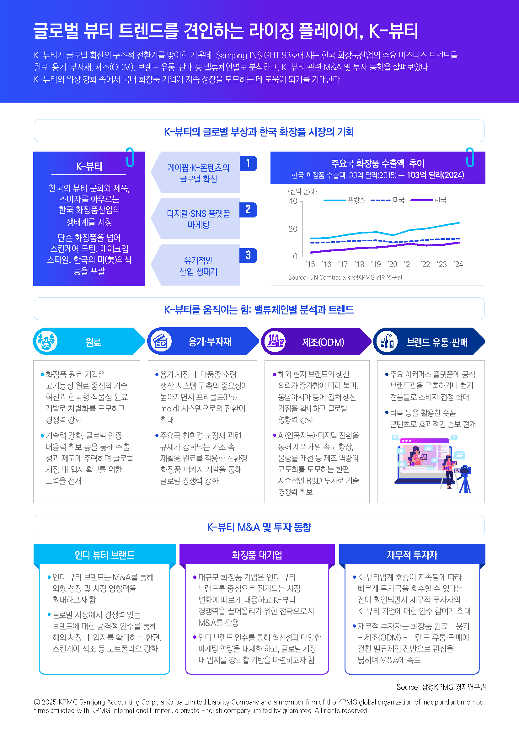 K-뷰티가 글로벌 확산의 구조적 전환기를 맞이한 가운데, 본 보고서는 한국 화장품산업의 주요 비즈니스 트렌드를 밸류체인별로 살펴보고 M&A 및 투자 동향을 분석하였습니다. 본 보고서가 K-뷰티의 위상 강화 속에서 국내 화장품 기업이 지속 성장을 도모하는 데 도움이 되기를 기대합니다.