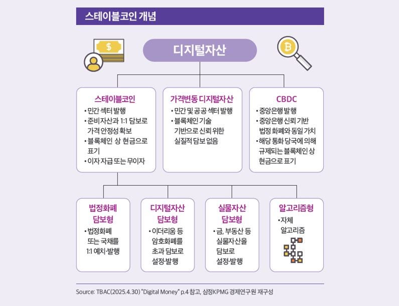 스테이블코인은 민간사업자가 발행하되, 특정 자산과 연동해 안정적(stable) 가치를 유지하도록 설계된 디지털자산으로 가격 안정성으로 인해 거래수단으로의 활용도가 높다. 2022년 가격 급락을 경험했던 알고리즘형 테라(Terra)와 달리, 최근 활용되는 것은 테라의 USDT와 서클의 USDC 등 달러에 연동된 법정화폐 담보형이다.