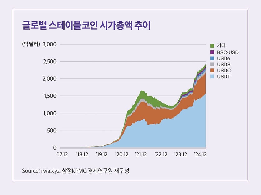이는 현금, 국채 등 고유동성 자산을 준비자산으로 보유해 가격 유지와 사용자 요청 시 상환하는 메커니즘을 표방한다. 토큰추적 플랫폼 rwa에 따르면 글로벌 스테이블코인의 시가총액(2025년 7월 17일 기준)은 2,444억 달러로 이 중 90%가 달러 기반이다. ‘1코인=1달러’라는 인식으로 달러 스테이블코인이 전 세계적으로 확산되고 있지만, 실제 담보자산 보유와 구성에 따라 시장의 신뢰가 좌우된다.