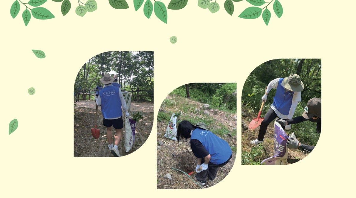 ‘Go Green’ 봉사단은 지난 2024년 4월, 세상을 더 밝고 건강하게 변화하는데 기여하고자 하는 마음으로 개설됐다. 바쁜 일상에도 손길이 필요한 곳에 온기를 전하고 있으며, 주로 나무 심기 봉사활동을 진행 중이다. 한 그루의 나무가 숲을 이루듯 작은 행동이 모여 큰 변화를 만든다는 믿음으로 매년 노을공원에서 나무심기 활동을 진행하고 있다. 주로, 4~5월 중 노을공원 봉사 담당자를 통해 노을공원 내 특정 포인트로 이동해 나무를 심는다. 활동은 대략 1~2시간 정도 소요되며, 나무를 모두 심은 후에는 무럭무럭 자라날 수 있도록 충분히 물을 주고 마무리된다.