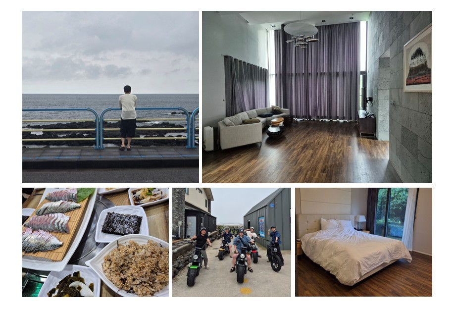 ‘제주 아트빌라스’는 이름처럼 예술적인 감각이 묻어나는 공간이었어요. 넓은 거실과 주방, 개별 테라스를 갖춘 객실은 깔끔하게 정돈돼 있었고, 주방에는 조리도구와 식기류가 잘 갖춰져 있어 간단한 요리도 가능했고, 침구도 포근해 편하게 쉴 수 있었고, 주변은 조용하고 프라이빗했어요. 차로 10분 거리에 중문에 위치한 관광지가 있어 이동이 편리했고요. 무엇보다 이번 여행의 최고 꿀팁은 ‘롯데호텔 수영장 이용권’입니다! 제주 아트빌라스 투숙객에게는 롯데호텔 수영장을 무료로, 인원 제한 없이, 2박 내내 이용할 수 있는 혜택이 주어졌어요. 이건 무조건 이용해야 합니다! 깨끗하고 넓은 수영장에서 친구들과 물놀이하며 보낸 시간이 정말 좋았습니다. 이번 여행을 통해 잠시 멈춰서 숨을 고르는 휴식의 시간과 친구들의 우정이 얼마나 중요한지 다시 느꼈습니다. 덕분에 업무에 복귀한 지금도 마음이 한결 여유롭고, 주변 동료들에게도 긍정적인 에너지를 나눌 수 있을 것 같습니다..