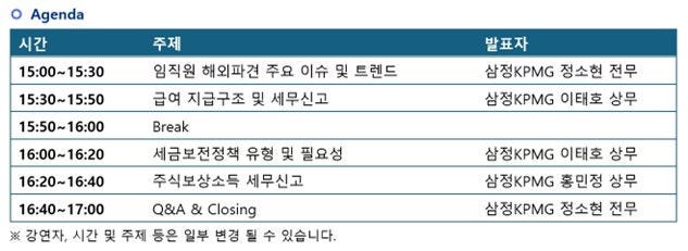 우선 정소현 삼정KPMG 전무가 발표를 맡아 임직원 해외파견 시 주요 이슈와 동향을 짚는다. 이태호 삼정KPMG 상무는 해외파견 임직원의 급여 지급구조 및 세무신고와 함께 세금 보전정책 유형을 소개한다. 홍민정 삼정KPMG 상무는 주식매수 선택권 및 제한 조건부 가상주식(RSU) 등 임직원에게 제공되는 주식 보상 기준에 대한 소득세 세무 처리를 가 설명한다.