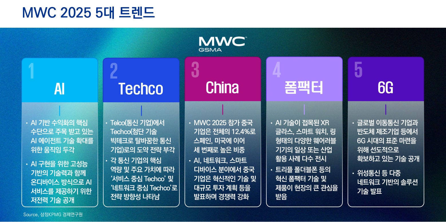 삼정KPMG가 세계 최대 이동통신 전시회 MWC(Mobile World Congress) 2025의 5대 주요 트렌드로 ▲인공지능(AI) ▲기술 중심 통신기업 ▲중국 ▲폼팩터 ▲6G를 선정했다.