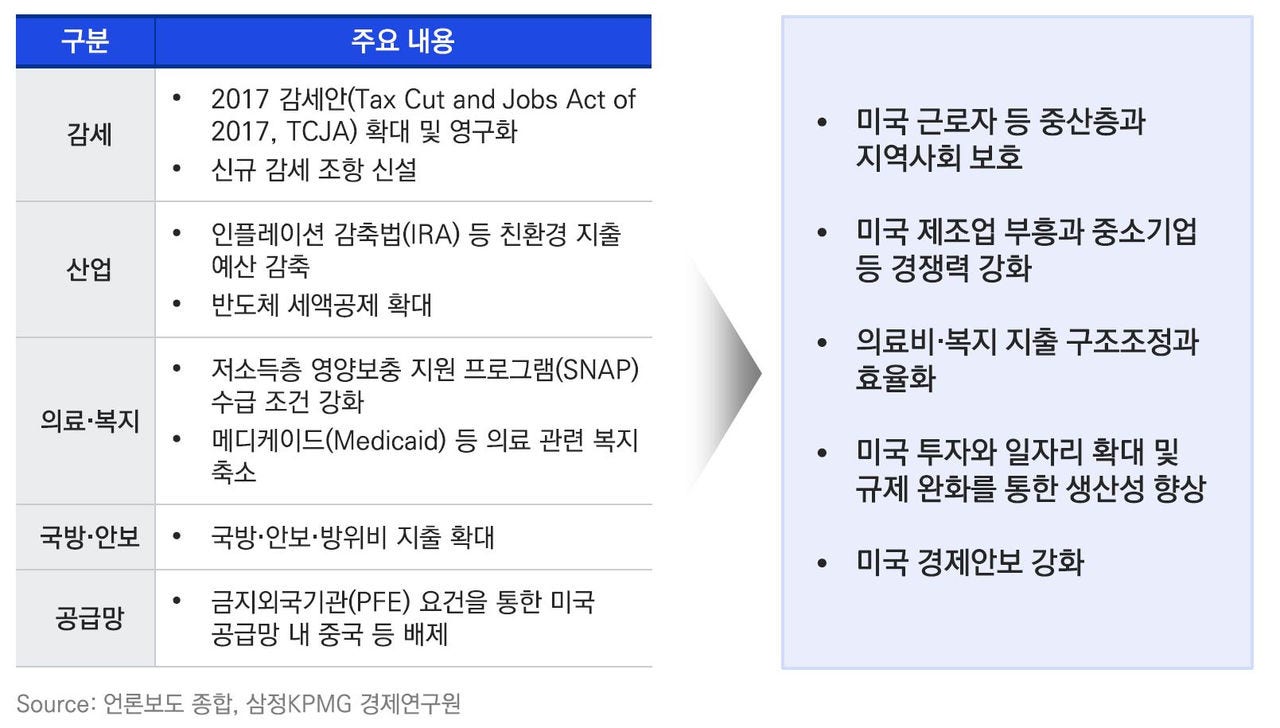 OBBBA 법안은 2017년 트럼프 행정부가 도입한 감세 정책을 연장하는 동시에, 바이든 행정부의 친환경 정책을 축소하고 미국 내 기업 투자를 확대하는 방향으로 조세 체계가 개편된 것이다.