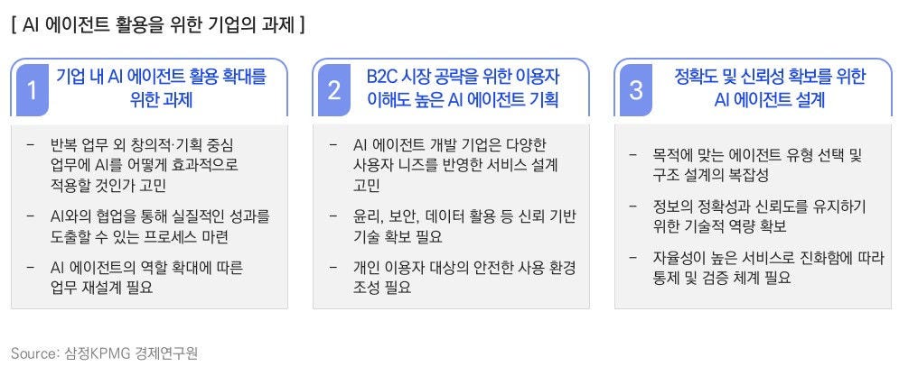 삼정KPMG는 AI 에이전트 도입 효과를 극대화하려면 명확한 혁신 방향성과 로드맵을 수립하고 이를 임직원과 공유해 조직 전체가 일관된 목표를 추구할 수 있도록 해야 한다고 강조했다. 동시에, 실질적 성과를 입증할 수 있는 측정 지표 마련도 필수적이다.