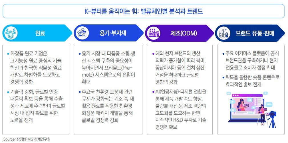삼정KPMG는 K-뷰티의 성장이 단일 브랜드나 제품의 성과에 그치지 않고, 원료부터 용기, 제조(ODM), 유통·판매에 이르기까지 밸류체인 전반의 혁신이 맞물린 결과라고 분석했다.