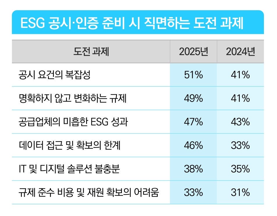 기업들이 ESG 공시 및 인증 과정에서 직면한 주요 도전 과제로는 ‘공시 요건의 복잡성’과 ‘불명확하고 변화하는 규제’가 가장 높은 비중을 차지했으며 ‘공급업체의 미흡한 ESG 성과’, ‘데이터 접근성 한계’, ‘IT 및 디지털 솔루션 불충분’, ‘규제 준수 비용 부담’ 등이 뒤를 이었다.