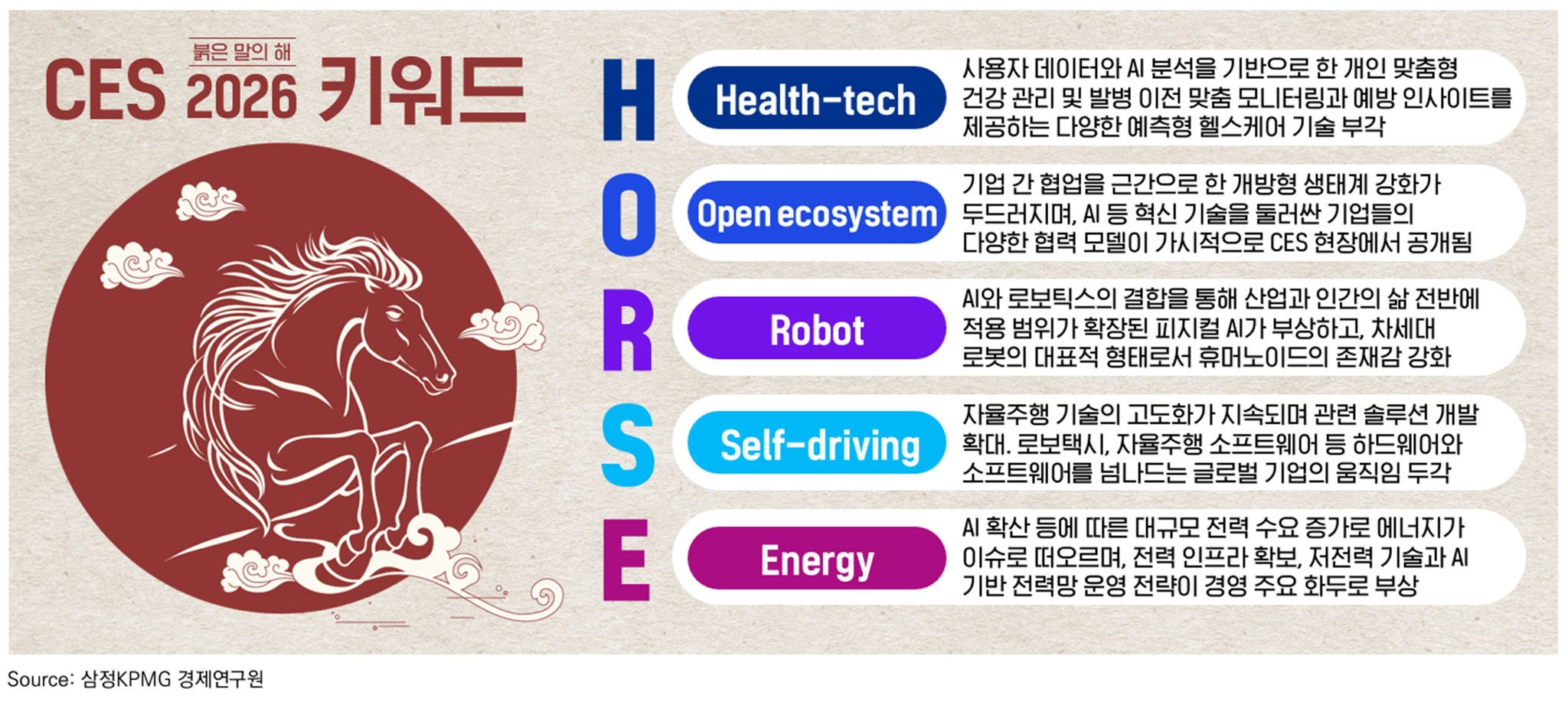 미국 라스베이거스에서 열린 세계 최대 ICT 융합 전시회 ‘CES 2026’의 핵심 키워드로는 '붉은 말의 해'와 관련된 ‘H·O·R·S·E(헬스테크, 오픈 생태계, 로봇, 자율주행, 에너지)’가 꼽혔다.