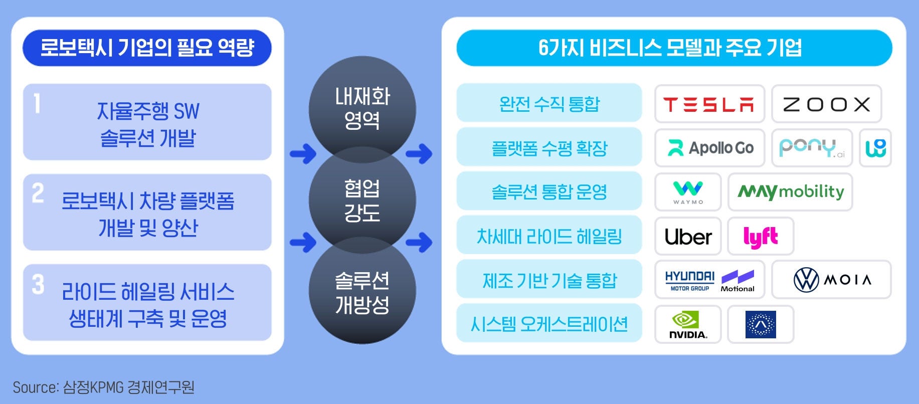 솔루션 통합 운영 모델은 외부 OEM과 긴밀히 협업하면서 자율주행 서비스 자체의 상품화에 집중한다. 웨이모(Waymo)가 여기에 해당한다. 차세대 라이드 헤일링 모델은 플랫폼 운영 역량을 중심으로 외부 기술을 결합하는 구조로 대표 기업은 우버(Uber)와 리프트(Lyft)가 있다.