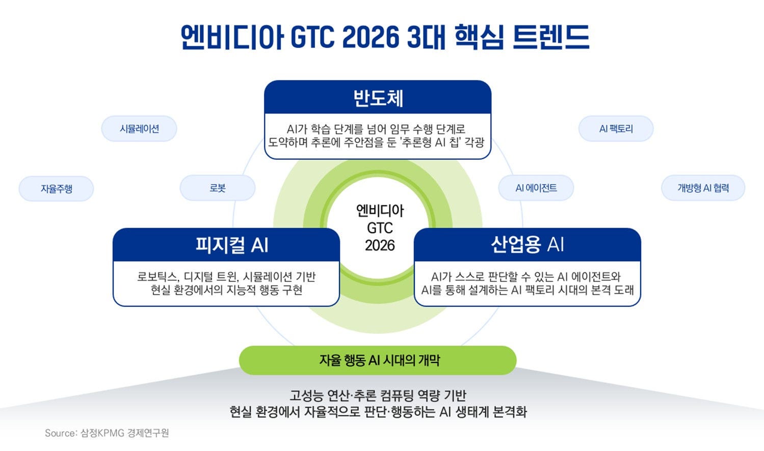 삼정KPMG 경제연구원은 “GTC 2026은 단순한 기술 발표를 넘어 글로벌 기업 간 협업을 통해 산업 생태계 변화 방향을 보여준 사례”라고 설명했다. 이어 “AI 산업 성장을 견인하는 엔비디아의 비전과 글로벌 시장 흐름을 종합적으로 분석해 기업들이 중장기 성장 전략을 수립할 필요가 있다”고 덧붙였다.
