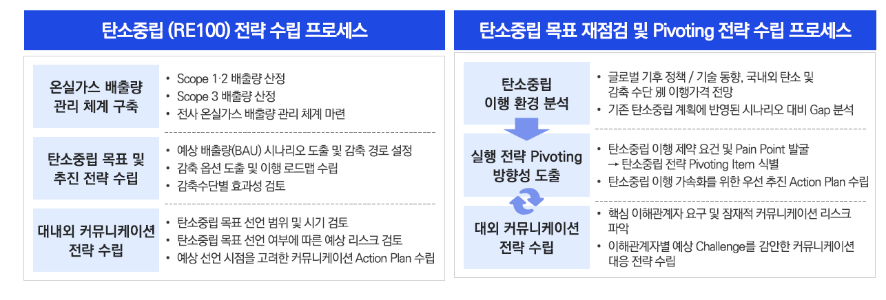 • 특히, 최근 대내·외 탄소중립 이행 환경 변화를 고려하여 기존에 수립한 탄소중립 목표 및 단/중기 계획 달성 가능 여부를 점검하는 한편, 실행 가능성을 고려한 탄소중립 Pivoting 전략 자문까지 제공
