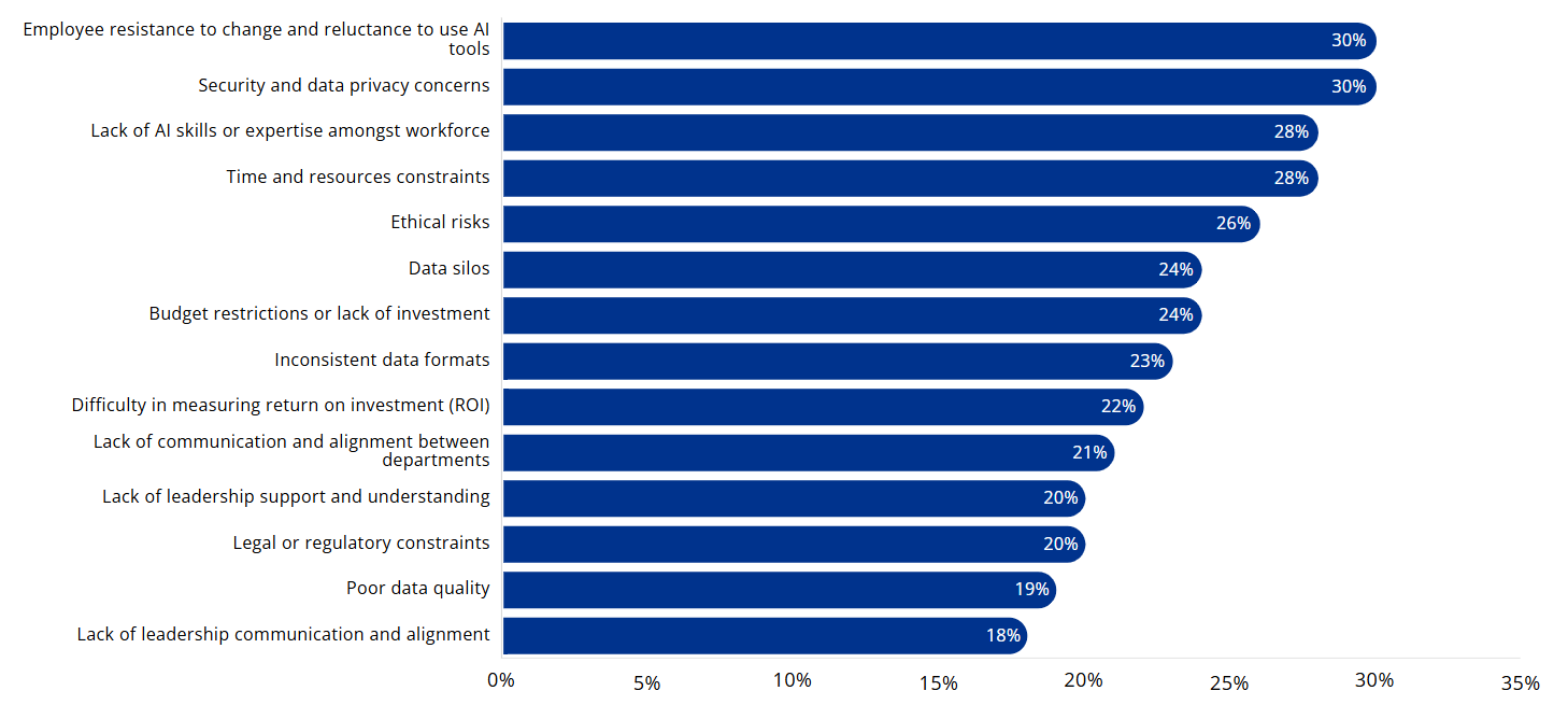 Strategic barriers are holding the Government sector back, with internal resistance and privacy risks the leading challenges when integrating AI