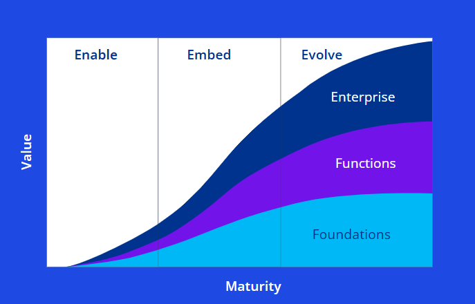 The Embed phase integrates AI into workflows, products, services, value streams, robotics, and wearables, delivering greater value. A senior leader drives enterprise-wide workforce redesign, re-skilling and change, embedding AI into operating models with a focus on ethics, trust and security. AI agents and diverse models are deployed, supported by cloud and legacy tech modernization, while enterprise-wide data enhances operations.